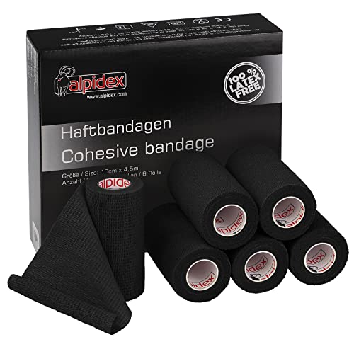 Sie erhalten 6 Rollen dieser Haftbandage mit einer Breite von 10 cm und einer Länge von 4,5 m. Die Bandagen sind in Schwarz gefärbt und können für Menschen und Tiere wie Hund, Katze oder Pferd eingesetzt werden.