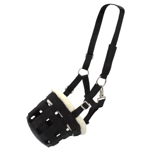 Die Kunstfell-Polsterung im Nasenbereich sorgt für ein hohes Maß an Komfort, während die Panik-Klettverschlüsse am Genick dem Pferd bei Gefahrensituationen helfen, sich selbst auszubefreien. Dieser Maulkorb Fressbremse ist direkt mit dem Halfter verbunden, was zusätzliche Ausrüstung überflüssig macht.