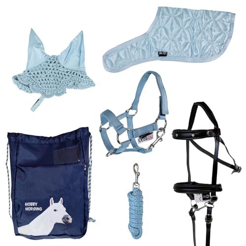 Das RL24 Hobby Horse Zubehör Set enthält alles, was du benötigst, um ein unvergessliches Hobby Horse Erlebnis zu haben. Das Set besteht aus einem Halfter mit Strick, Decke und Fliegenhaube in Hellbau, einer Trense in Schwarz und einem praktischen Transportbeutel für Stockpferde.
