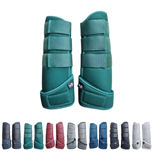 Die Gamaschen sind aus elastischem Softopren gefertigt, was sie atmungsaktiv und anatomisch geformt macht. Sie schmiegen sich an die Pferdebeine an und verhindern so Druckstellen und Reibungen.